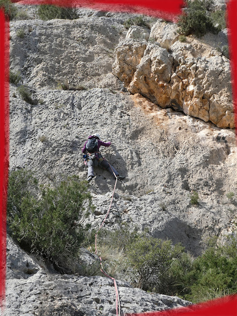 La vía: Cuando veo un espolón no lo puedo resistir, no se que tienen pero me atraen, me gustan. Preciosa vía, fácil y muy bien equipada, pero hay que tener cuidado en esta escuela, las vías antiguas estan graduadas a la baja, las nuevas tienen un grado más acorde a lo que estamos acostumbrados, ésta es de las antiguas, yo creo que es IVº el primer largo y Vº el segundo. El primer largo tiene la primera chapa un poco alta pero es muy fácil llegar, luego es un IV aéreo y mantenido, reunión cómoda. El segundo es muy bonito y también muy aéreo, con pequeña bavaresa en la segunda chapa, reunión en lo alto y nosotros hicimos dos rapeles por la vía.