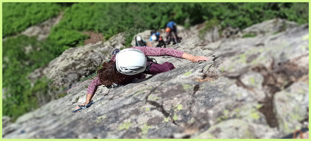 En las fotos de arriba vemos en difernetes momentos del diedro a Lluis, Loli y Viki, es más fácil de lo que parece, tiene muy buenos agarres. Abajo Loli aproximándose al paso del espejo, este si es más duro de lo que parece, es un 5C de los buenos, pero se acera perfectamente.