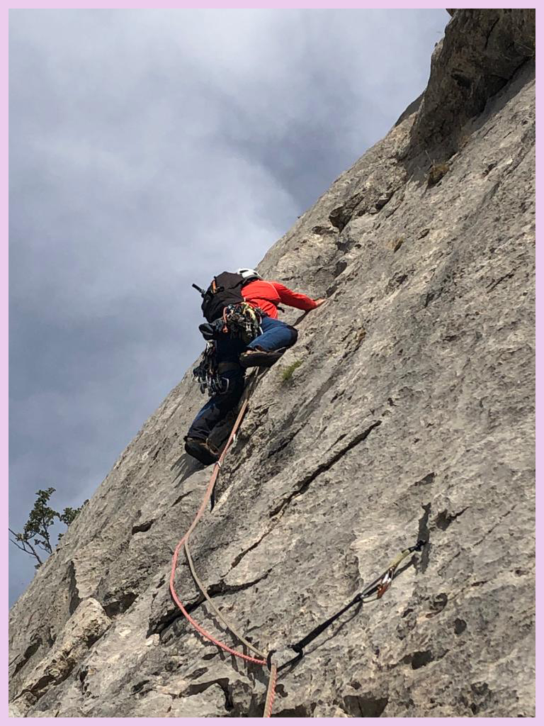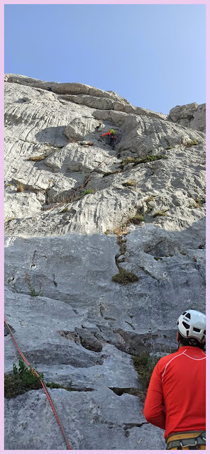 En las fotos de arriba Gema en el primer largo de la vía, lo dan de cuarto, pero en el sitio de la foto hay que apretar un poco y proteger bien, para ella era su primer largo limpio, su primera vez en autoprotección, y la primera del día, fue una gra experiencia para ella que superó con creces, son muchas cosas juntas que hay que resolver, por eso las fotos llevan un contorno rosa, para que luzcan su color favorito.